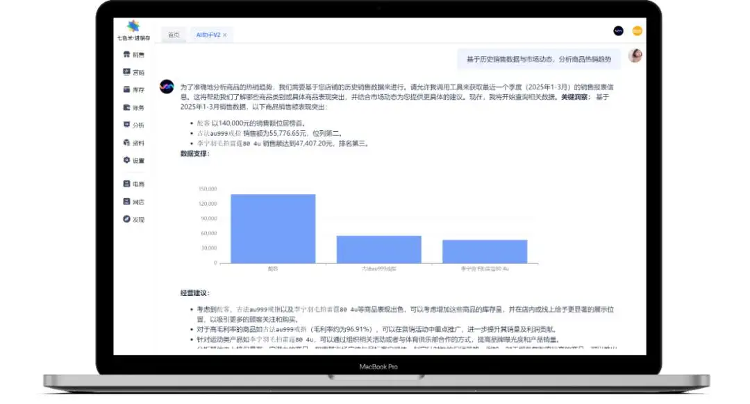 4. 报告生成:输入分析需求,AI秒级生成多维度数据报告(如周/月销售简报、渠道效果对比),省去人工整理时间。