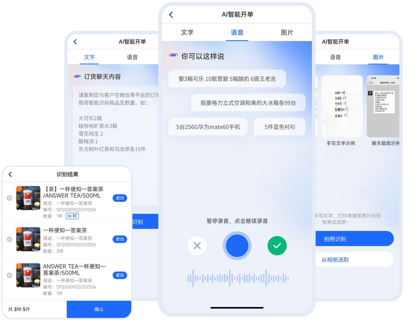 ● 其 AI 智能开单功能(文本开单、语音开单、图片开单),节省了人工录入订单的时间和人力成本。例如,复制订货聊天内容或拍照上传图片就能快速开单,减少人工操作失误。