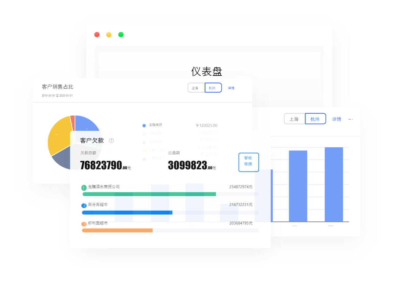 ● BI看板:自由生成资金分布、库存占用、商品销量趋势等可视化图表