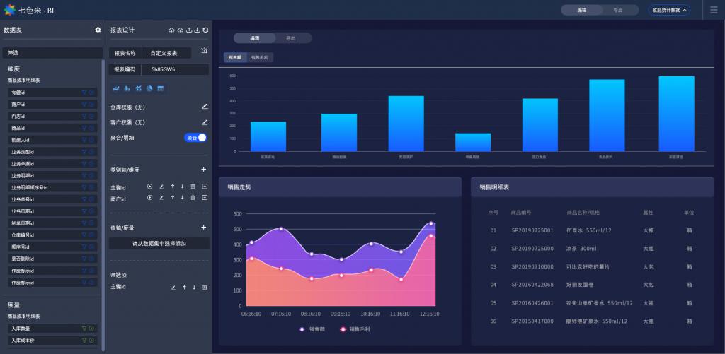 七色米 BI 打通盈云科技旗下七色米进销存、七色米订货、七色米 SCRM 等系列商家服务产品 , 实现了多产品数据的互通利用。笔者有幸进入七色米 BI 产品内观察到 ,BI 产品不仅操作简单便捷 , 而且图形展示页美观清楚 , 设计器设计的也非常的人性化。在深入了解之后发现 , 七色米 BI 是一个人人会用的分析工具 , 赋能企业内普通业务员 , 让企业内普通业务员通过简单拖拉拽就能进行自助式数据分析。普通业务员就能 " 增加字段、删减字段、筛选数据 , 随时生成 "。真正的实现了数据报表的灵活自定义 , 帮助中间商商家实现全方位的数据洞察。