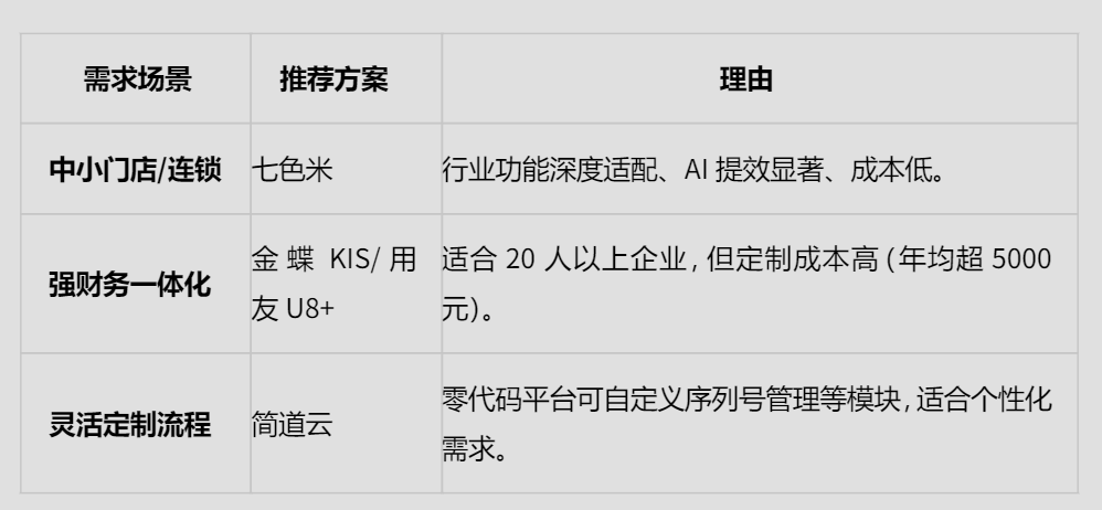 总结 :七色米凭借 行业场景深度优化、AI效率工具、亲民定价 ,成为中小型家电数码企业的性价比之选。建议通过试用验证实际需求匹配度,再结合长期发展(如扩张至中大型规模时)评估是否需要升级至业财一体系统。