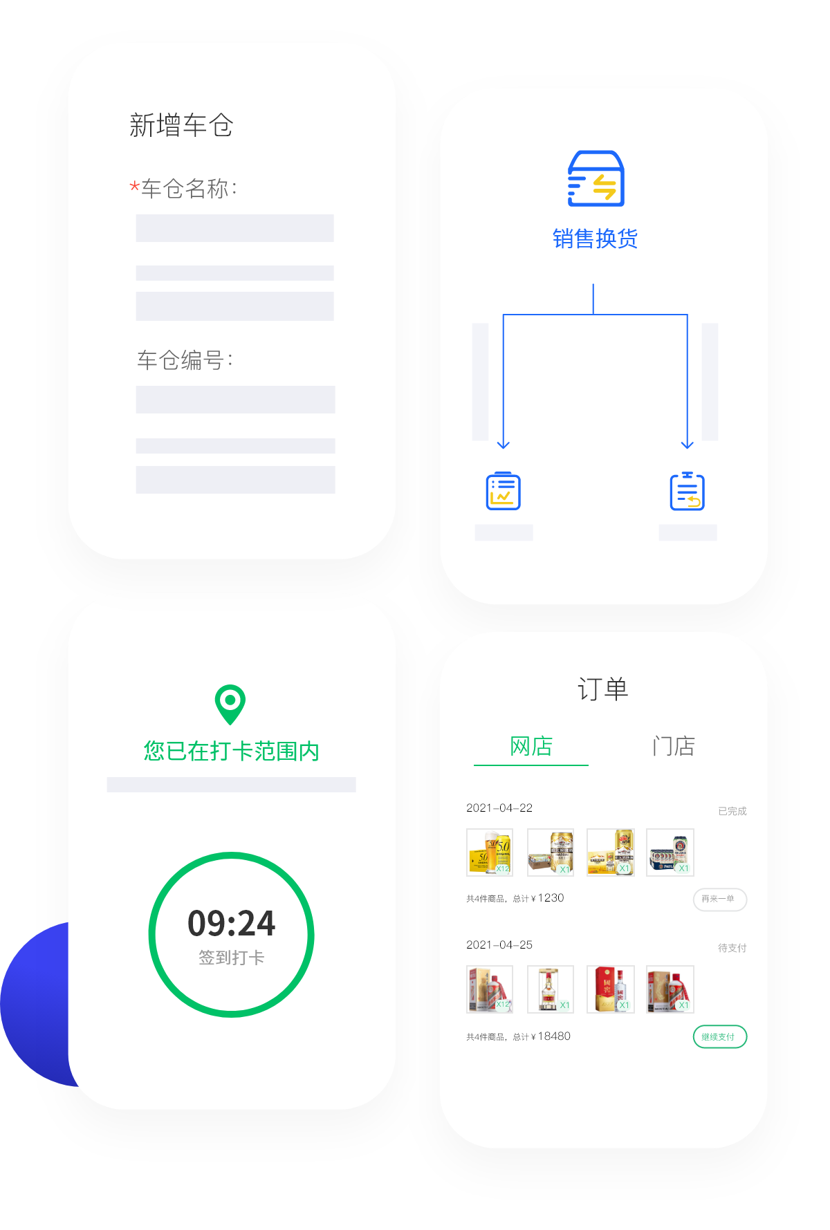 助力商户线上线下一体化,商家老客户可使用ERP线上商城自主选购,实现线上下单,线下配送,让拜访更高效。